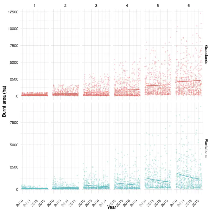 Changes in land use, climate, and socio-ecology drive altered fire regimes that in turn reshape global ecosystems. Rapid afforestation with commercial tree plantations is transforming fire-prone savannas and grasslands globally and particularly in tropical South America, yet its effects on fire dynamics remain poorly understood. Using hierarchical models, we analysed trends in annual burned area within concentric buffers (1 to 6 km) around each of 44 plantation and 52 grassland sites in Colombia’s Orinoquia region—a savanna grassland forest mosaic undergoing major land-use transitions from the expansion of commercial tree plantations. Plantations reduced burned areas in two ways: order-of-magnitude increases in plantation area reduced burnt area by 15% and plantation sites reduced their burnt area by 2% each year; both results consistent with trees replacing more inflammable grassland vegetation. While the mechanisms behind divergent savanna/plantation fire dynamics remain unresolved and could involve active fuel management and fire response, increased canopy cover or some combination thereof, this study provides spatially explicit, context-sensitive evidence on how land-use transitions interact with fire regimes with direct relevance for grasslands and savanna management and climate adaptation policy in South America.