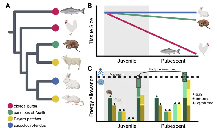Background Almost all mammals rely on the thymus and bone marrow to generate and differentiate B and T cells essential for adaptive immunity. A few members of the family Soricidae, or true shrews within Eulipotyphla, have also evolved an enlarged pancreas of Aselli, a kidney-sized organ hypothesized to serve this primary immune role, and whose gene expression profile is unknown. Results Here we introduce transcriptomes of juvenile Eurasian common shrews (Sorex araneus, family Soricidae) pancreas of Aselli. We compare these to those of the shrew spleen and chick bursa of Fabricius, an analogous, bird- specific organ, and explore differential expression overlaps with positively selected genes. Differential gene expression analyses revealed higher expression of genes that regulate the differentiation of B cells into long-term plasma cells (e.g., IRF4, XBP1, PRDM1) compared to the spleen and more convergent expression with the bursa of Fabricius than expected by chance (including IRF4). Overlaps with positive selection were as expected and included PTPRCAP, which regulates both T and B cell antigen responses and lymph node size. Conclusions Our results support the specialized role of the pancreas of Aselli in adaptive immunity, and we propose this uniquely enlarged organ evolved at the intersection between extreme metabolic demands and high parasite burdens in tiny yet very active shrews.