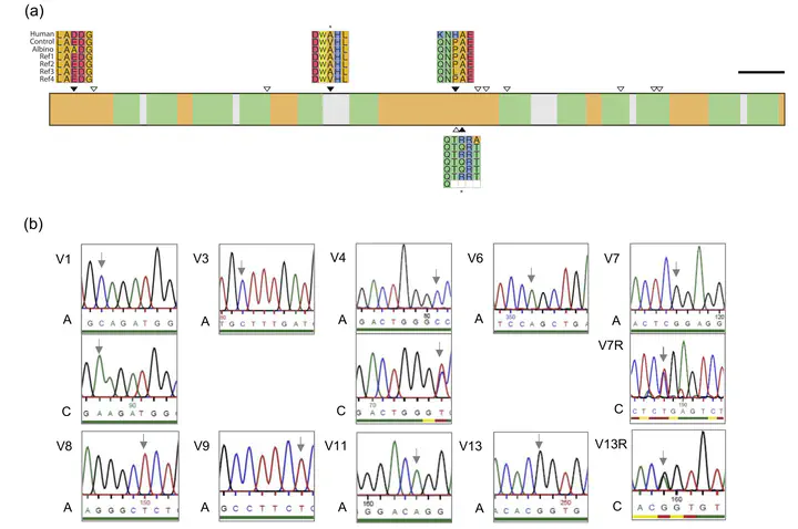 Oculocutaneous albinism—characterized by absent or decreased melanin in the skin, eyes and hair—often co-occurs with sensory, skin and immunity disorders. The genetic basis of albinism in humans is complex, with many loci implicated in multiple forms of the disorder. Less is known about the underlying genetic causes of albinism and leucism in other species, and cross-species studies of the molecular correlates of hypopigmentation could highlight common and conserved pathways underlying mammalian pigmentation disorders. We characterize the putative causal loci of reduced pigmentation in an Egyptian fruit bat (Rousettus aegyptiacus) that displayed features indicative of albinism. Despite albino or leucistic individuals having been reported in >100 bat species, the associated genetic backgrounds have not previously been studied. We used a digital gene expression panel to quantify mRNA levels in wing membrane samples of four candidate pigmentation genes in the focal albino fruit bat and control individuals. Significantly reduced SLC45A2 mRNA expression was found in the albino compared to five bats with typical coloration. Additionally, intraspecific sequence analyses of the albino bat SLC45A2 coding sequence identified two missense mutations, E18A and Q298R, the former of which was private to the albino bat. Position 18 of SLC45A2 was otherwise found to be highly conserved across 60 bat species and has not been previously linked to human albinism. By identifying SLC45A2 as the likely contributing locus, our results also indicate further support for the necessity of genetic testing for the reliable categorization of hypopigmented animals as either albino or leucistic.